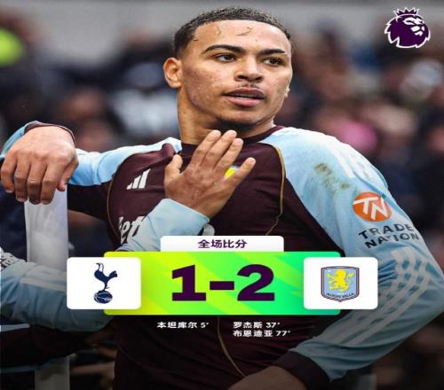 英超第8轮,阿斯顿维拉客场2比1逆转托特纳姆热刺。第5分钟,帕利尼亚后点头球回做,本坦库尔射门得分;第37分钟,罗杰斯禁区外远射破门扳平比分;第77分钟,布恩迪亚禁区前沿左脚远射反超。 维拉在开季6场不胜后,最近取得了各项赛事5连胜,积分追平布莱顿,回到积分榜中游。托马斯·弗兰克执教英超以来,6次对阵埃梅里执教的球队未尝胜绩(2平4负),这是他交手过的主教练中次数最多却从未获胜的一个。