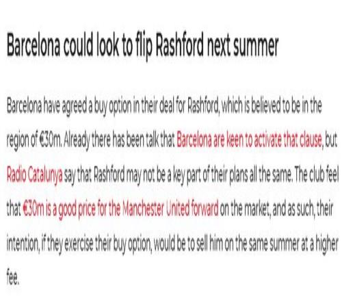 加泰罗尼亚电台宣称,巴萨拥有3000万欧元买断拉什福德的选项,考虑到他本赛季的表现,拉波尔塔和管理团队觉得,签下他之后可以转手卖掉,价格可能远高于这个数字!