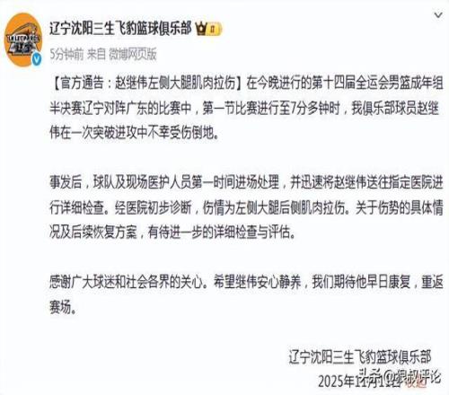 辽宁男篮官方:赵继伟诊断左侧大腿肌肉拉伤后续恢复需详细检查
