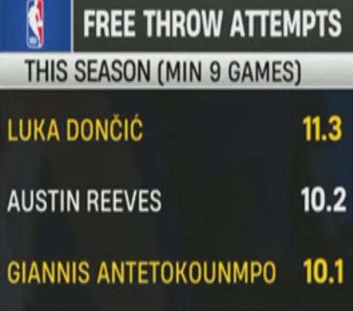 东契奇以场均11.3次罚球高居第1,身后是场均10.2次罚球的里夫斯、场均10.1次罚球的字母哥和场均9.3次罚球的班切罗。