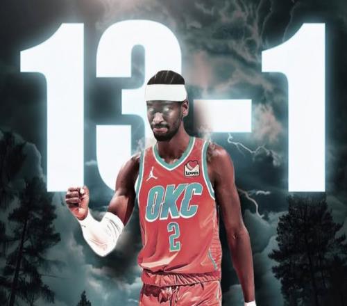 赛季至今,雷霆已经13胜1负,只是背靠背第二场比赛里以2分惜败给开拓者,其余的比赛都是一副摧枯拉朽的模样。