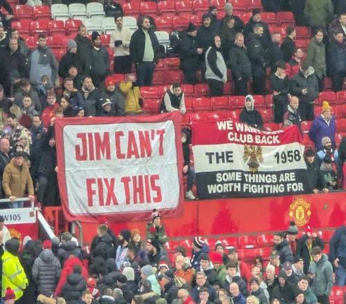 足总杯第三轮,曼联在老特拉福德球场1-2不敌布莱顿被淘汰出局。红魔球迷在看台上打出了“吉姆解决不了这个问题”的横幅。
