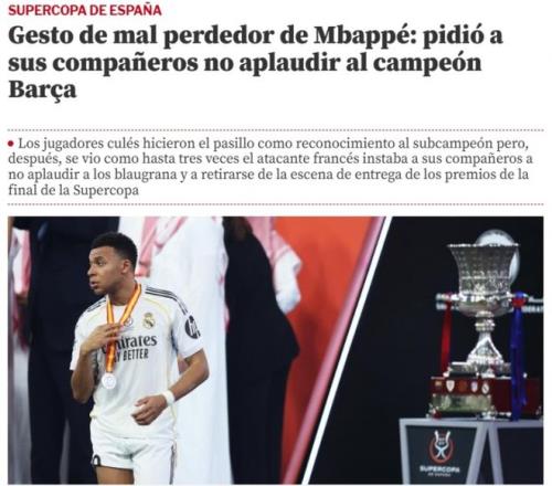 据悉,姆巴佩要求他的队友们不要为巴萨鼓掌,巴萨球员为他们进行了列队,但姆巴佩却三次敦促他的队友们不要为巴萨鼓掌,并尽早离开超级杯决赛颁奖典礼现场。