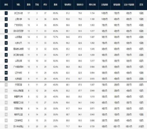排名第五的是山东男篮,目前是14胜5负的战绩。山东男篮少打了一场比赛,按照胜率来看的话,山东男篮要比深圳男篮更高。不过由于CBA官方排名是按照积分来的,少打一场比赛的山东男篮就比较吃亏了,否则位居四强的就应该是山东男篮而非深圳男篮了。