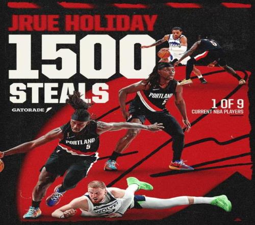 霍勒迪达成生涯1500次抢断里程碑,成为现役第9人。